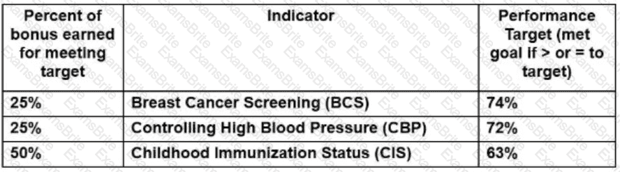Each provider in a primary care practice has the potential of earning a $20,000 bonus based on individual performance on select Healthcare Effectiveness Data and Information Set (HEDIS) indicators.