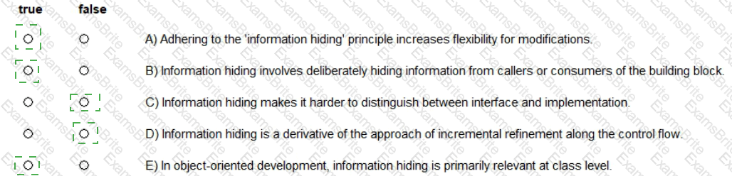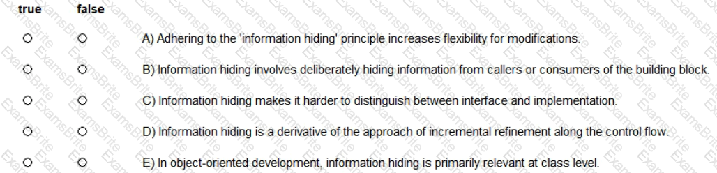 Which of the following statements regarding the design principle ‘information hiding’ are true and which are false? (Assign all answers.)