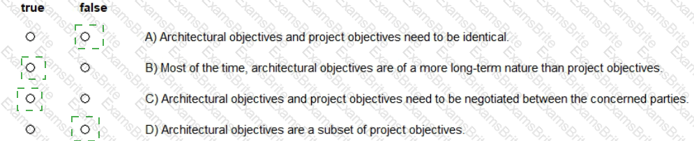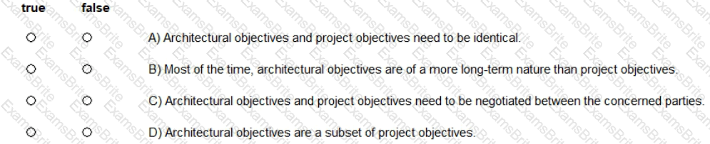Which statements with regard to project objectives and architectural objectives are true and which are false? (Assign all answers.)