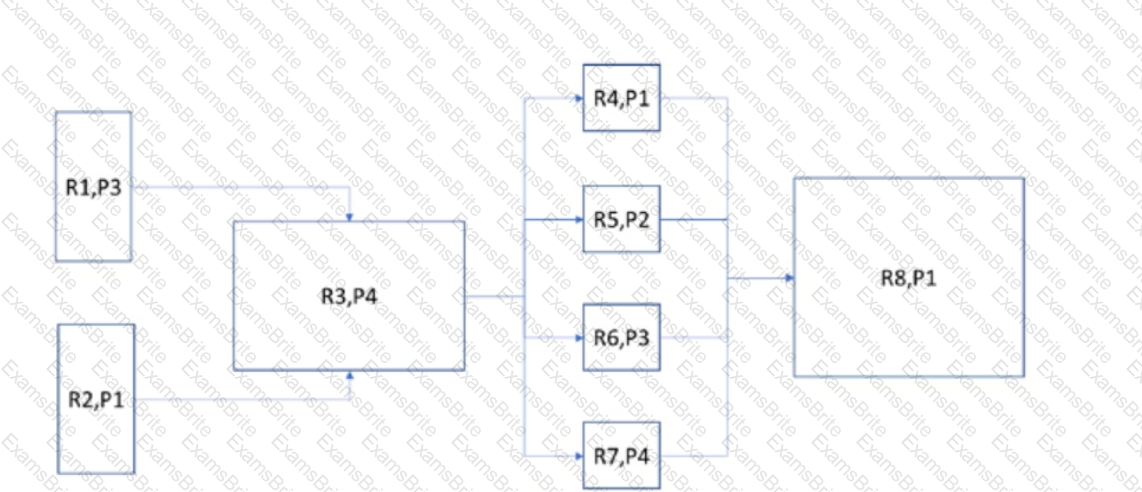 The following diagram displays the logical dependencies between requirements and the individual requirement priorities. For example, "R2->R3" means that R3 is dependent on R2. Priority is indicated by the number next to the letter ”P" i.e. P1 has a higher priority than P2.