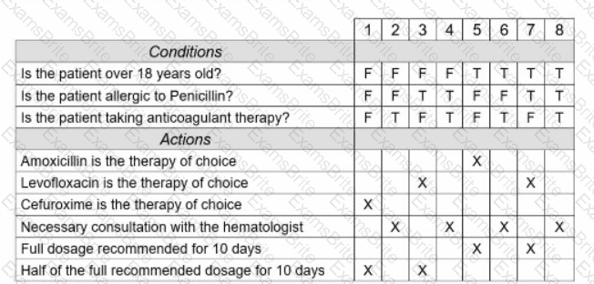 The following decision table is used to assist a doctor in determining the drug therapy to prescribe for a patient (aged 6 to 65 years) diagnosed with acute sinusitis. The table consists of three Boolean conditions and six actions: