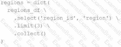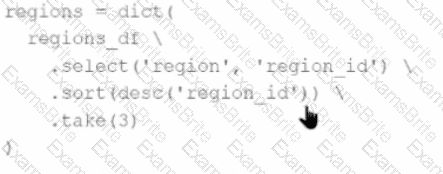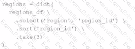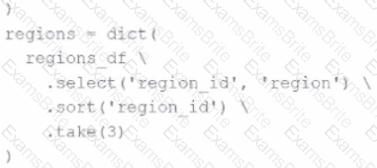 The resulting Python dictionary must contain a mapping of region -> region id containing the smallest 3 region_id values.