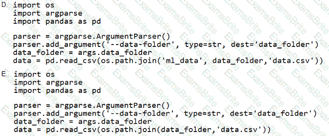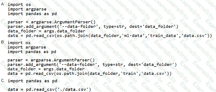You define a datastore named ml-data for an Azure Storage blob container. In the container, you have a folder named train that contains a file named data.csv. You plan to use the file to train a model by using the Azure Machine Learning SDK.