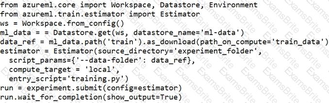 You create a Python script that runs a training experiment in Azure Machine Learning. The script uses the Azure Machine Learning SDK for Python.