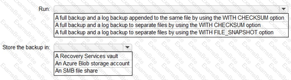 What should you run for the backup and where should you store the backup? To answer, select the appropriate options in the answer area.