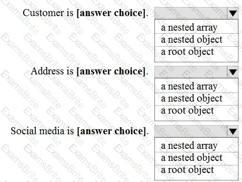 Use the drop-down menus to select the answer choice that completes each statement based on the information presented in the JSON document.