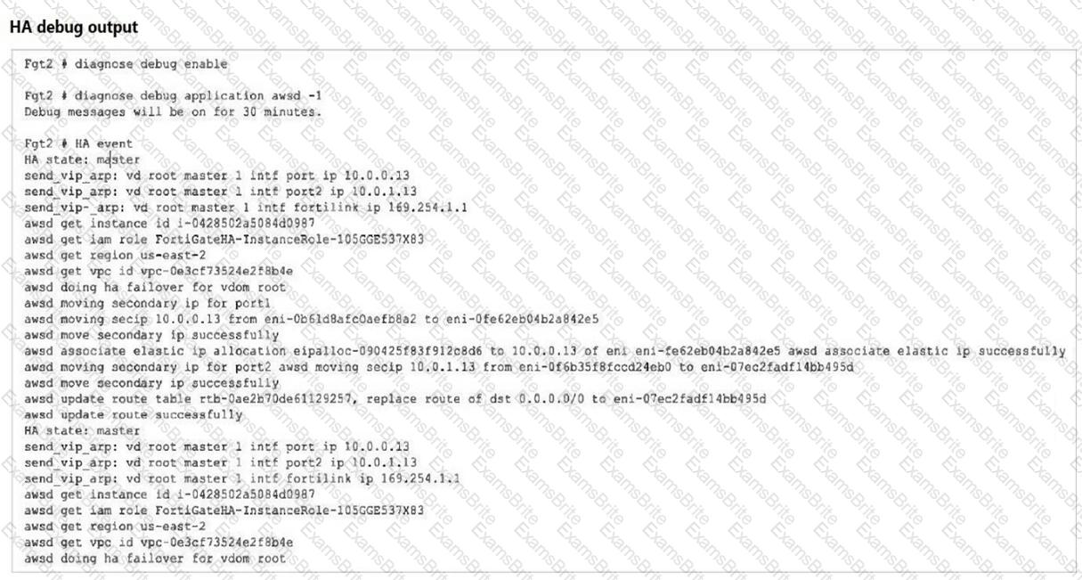 You deployed an active-passive FortiGate HA cluster using a CloudFormation template on an existing VPC. Now you want to test active-passive FortiGate HA failover by running a debug so you can see the API calls to change the Elastic and secondary IP addresses.
