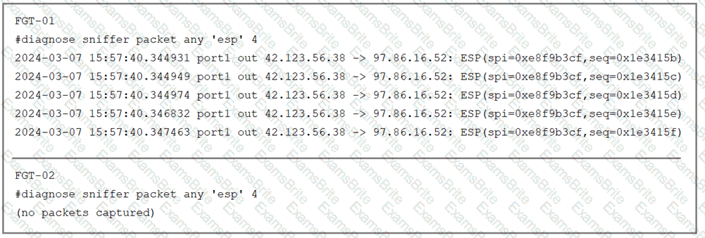The sniffer log on two FortiGate devices are shown. Based on the information in the log, which two factors explain the output on FortiGate FGT-02? (Choose two answers)