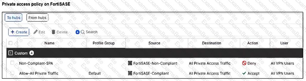 A FortiSASE administrator has configured FortiSASE as a spoke to a FortiGate hub. The tunnel is up to the FortiGate hub. However, the remote FortiClient is not able to access the web server hosted behind the FortiGate hub.