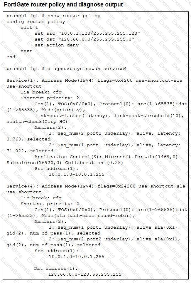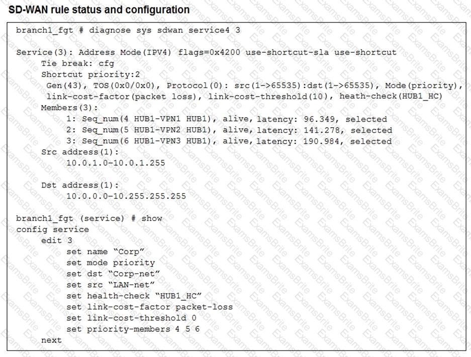 An administrator is troubleshooting SD-WAN on FortiGate. A device behind branch1_fgt generates traffic to the 10.0.0.0/8 network.