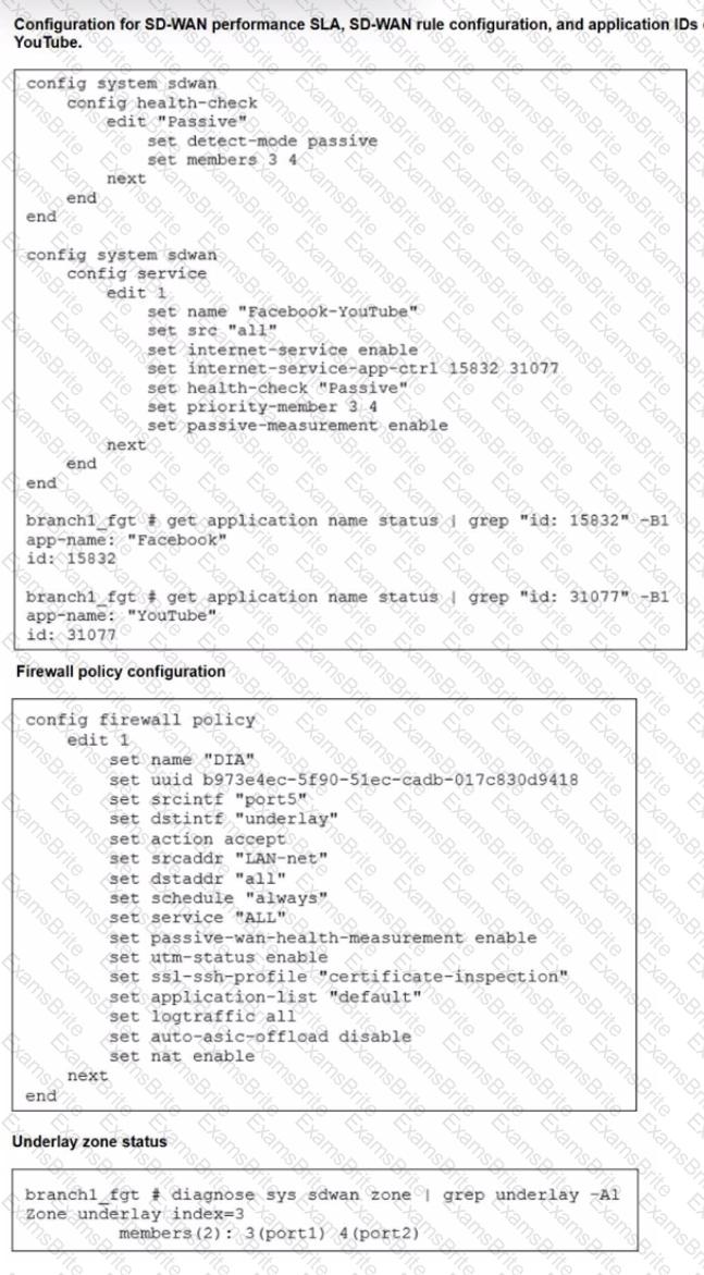 The exhibits show the configuration for SD-WAN performance. SD-WAN rule, the application IDs of Facebook and YouTube along with the firewall policy configuration and the underlay zone status.
