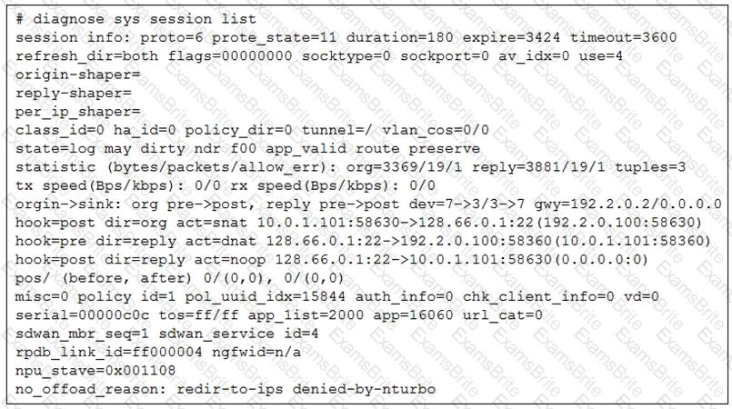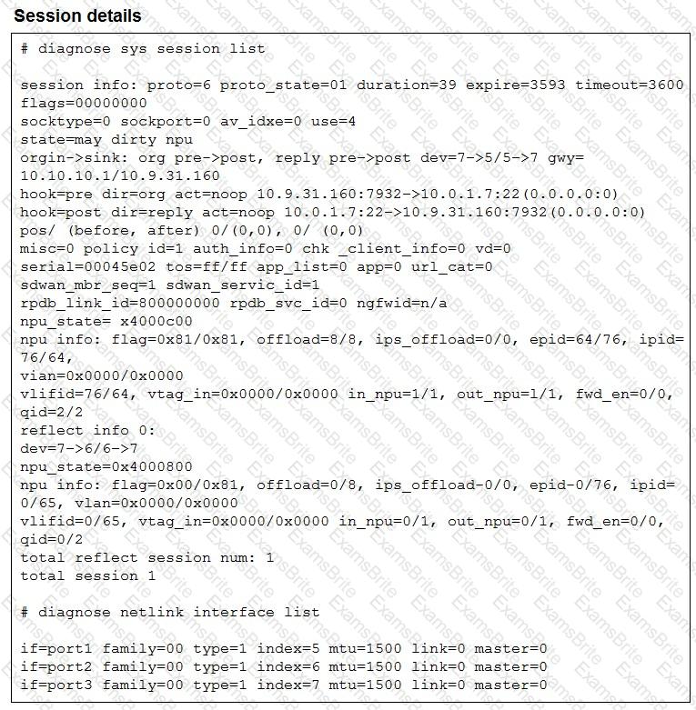 The exhibit shows the details of a session and the index numbers of some relevant interfaces on a FortiGate device that supports hardware offloading.