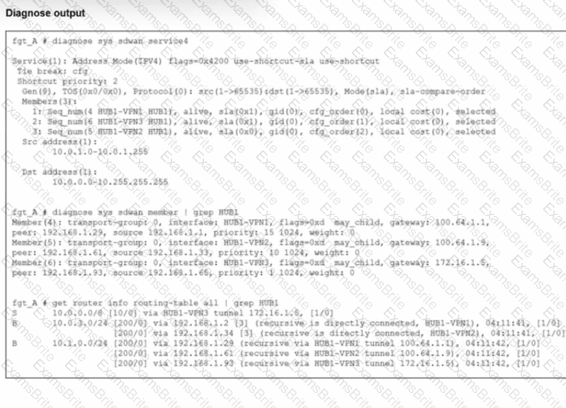 An administrator is troubleshooting SD-WAN on FortiGate. A device behind branch1_fgt generates traffic to the 10.0.0.0/8 network.