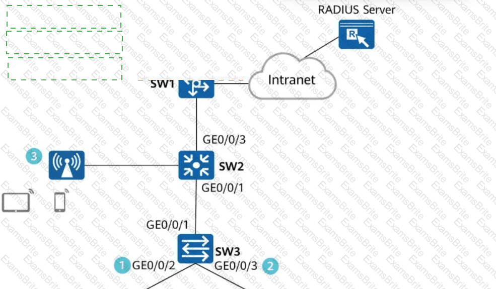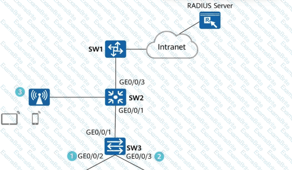 Which of the following steps are mandatory to enable 802.1X authentication on GE0/0/2 and GE0/0/3 of SW3 and configure a RADIUS server to authenticate and deliver network access rights to users?