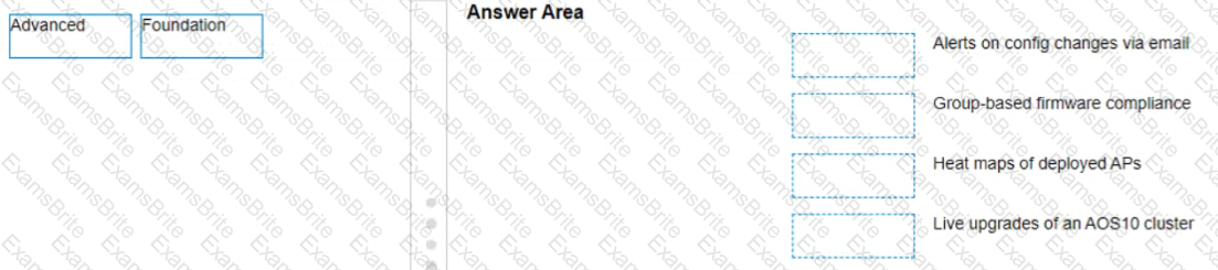 A network administrator with existing IAP-315 access points is interested in Aruba Central and needs to know which license is required for specific features Please match the required license per feature (Matches may be used more than once.)