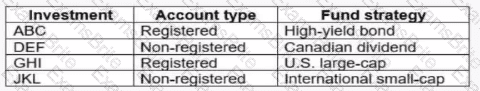 Darryl has a diversified investment portfolio of mutual funds in a non-registered account with Investwell Mutual Funds, a mutual fund dealer. Darryl’s diversified portfolio is composed of 3 mutual funds. Each mutual fund is currently worth about $100,000. The ABC Canadian Equity Fund has a total return of 6%, the DEF Bond Fund has a total return of 8% and GHI Global Equity Fund has a total return of 10%. Darryl wants to make an in-kind contribution to his registered retirement savings plan (RRSP) account. He has unused RRSP contribution room of $60,000.