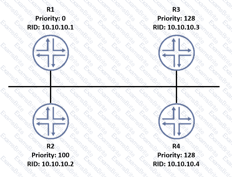 You have two OSPF routers forming an adjacency. R1 has a priority of 32 and a router ID of 192.168.1.2. R2 has a priority of 64 and a router ID of 192.168.1.1. The routers were started at the same time and all other OSPF settings are the default settings.