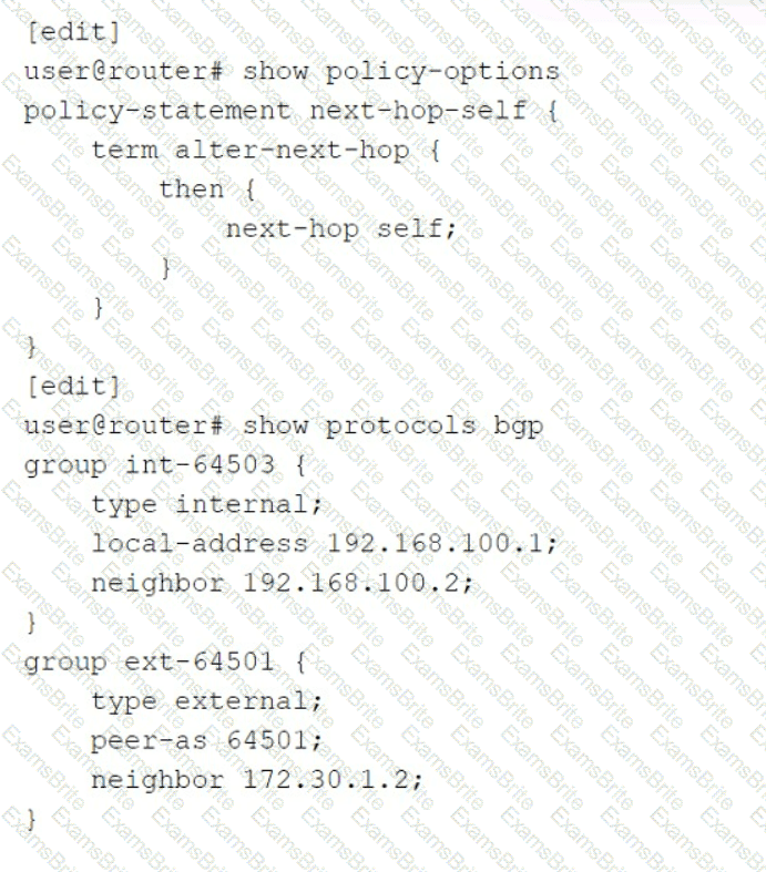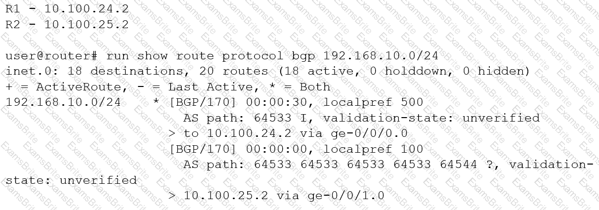 R1 has a BGP session with a router that has a peer autonomous system number of 64501. It is exchanging routes, and is advertising those routes to IBGP peers. The downstream IBGP