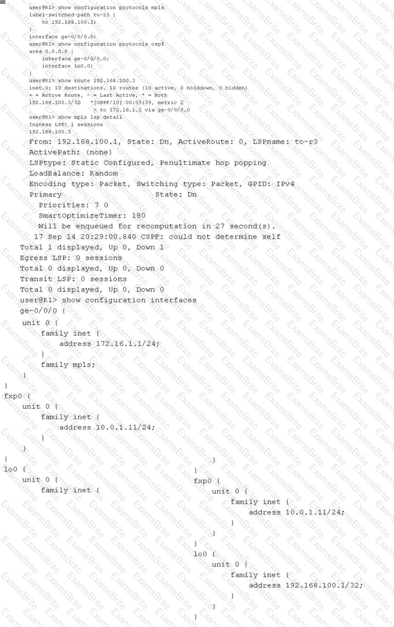You have configured an MPLS LSP to 192.168.100.3. However, the LSP is in the down state. Referring to the exhibit, which two actions would solve this problem? (Choose two.)