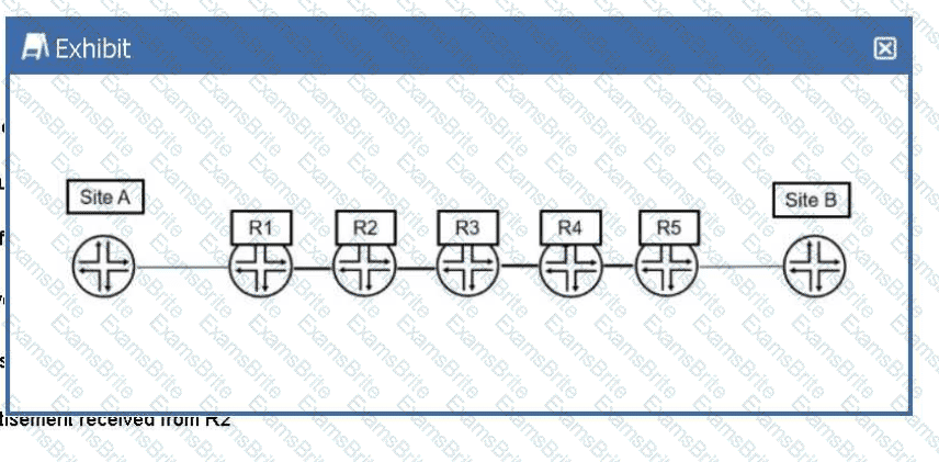 In the exhibit, Site A is sending traffic to Site B. R1 adds MPLS label 7166 to direct the traffic to R5. Which two criteria did R1 use to determine which label number to add to the traffic? (Choose two.)