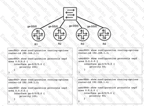 Referring to the exhibit, you have configured R1, R2, R3, and R4 to be a part of OSPF area 0 and you have connected them to a broadcast segment. Assuming all four routers come online within one minute of each other, which router becomes the DR and which router becomes the BDR?
