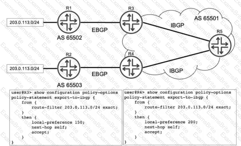Referring to the exhibit, R1 and R2 are advertising the same prefix 203.0.113.0/24 to R3 and R4 over EBGP. R3 and R4 both advertise this prefix to R5. Which advertisement does R5 choose to install in its routing table?