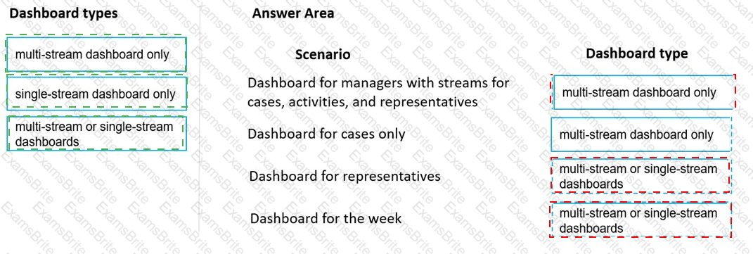 Which dashboard types should you use? To answer, drag the appropriate dashboard types to the correct scenario. Each dashboard type may be used once, more than once, or not at all. You may need to drag the split bar between panes or scroll to view content.