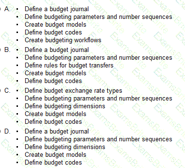 A company plans to use Dynamics 365 for Finance and Operations. You need to configure basic budgeting. Which set of actions must you perform?