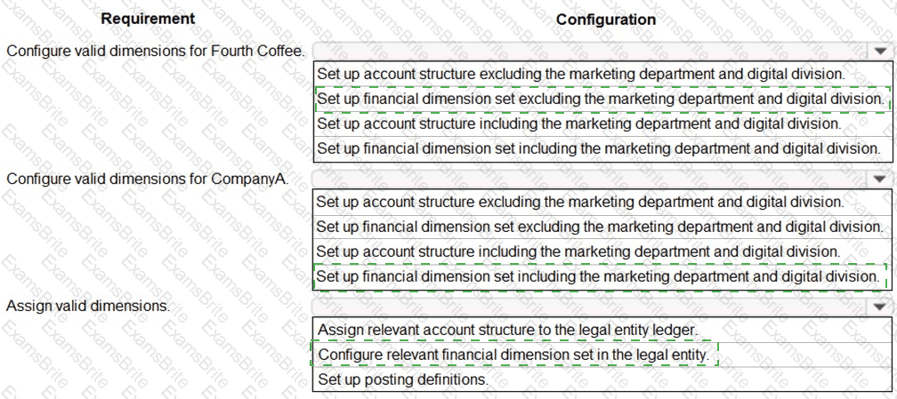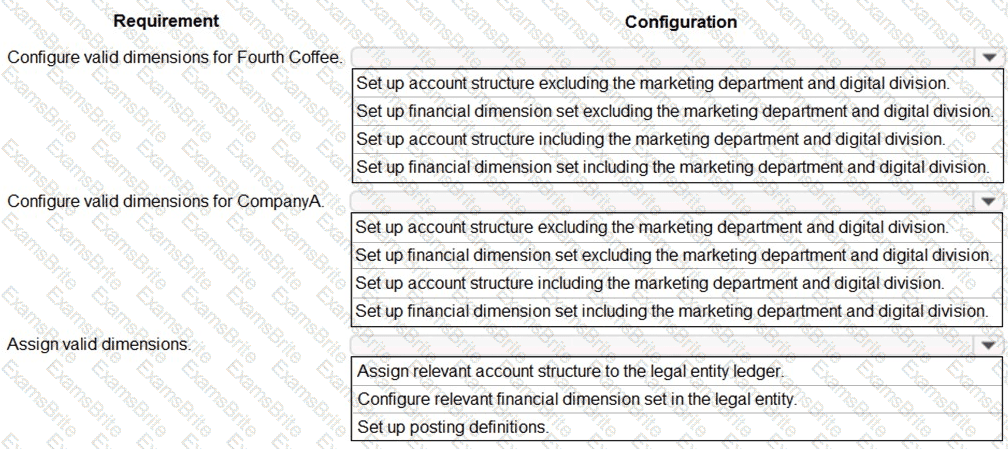 A client has one legal entity, two departments, and two divisions. The client is implementing Dynamics 365 Finance. The departments and divisions are set up as financial dimensions.