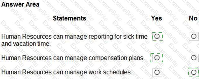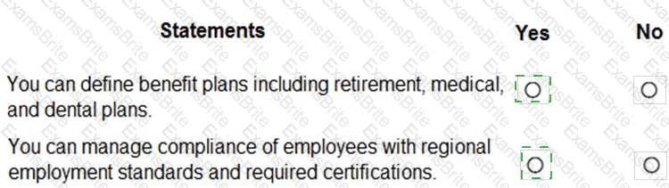 A customer wants to implement Dynamics 365 Human Resources to manage employee benefits. For each of the following statements, select Yes if the statement is true. Otherwise, select No.
