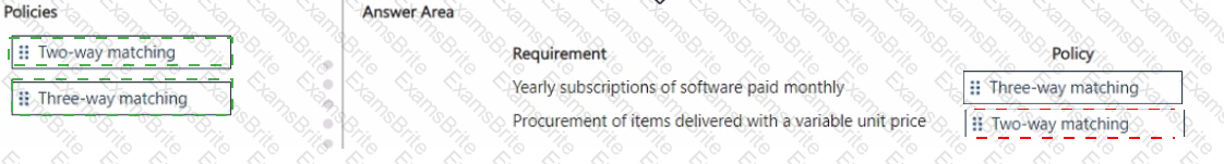 Which invoice line matching policies should you recommend? To answer, drag the appropriate policies to the correct requirements. Each policy may be used once, more than once, or not at all. You may need to drag the split bar between panes or scroll to view content.