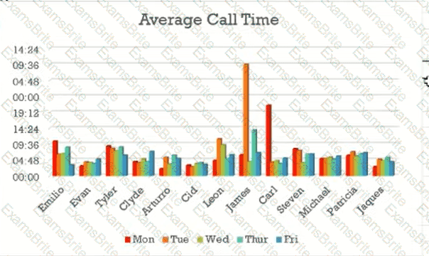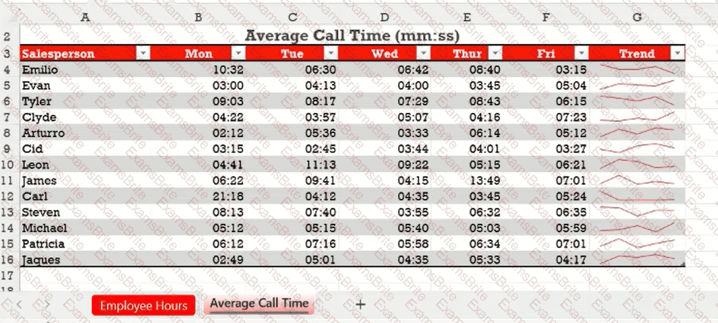 On the Average Call Time worksheet, create a 3-D Clustered Column chart that shows the call times for each Salesperson from Mon through Fri. Insertthe Chart Title Average Call Time. Position the new chart below the table.