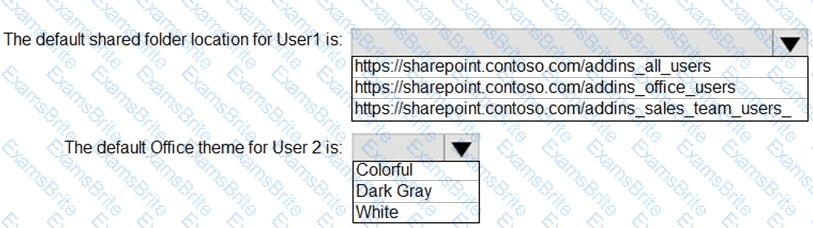 What is the default share folder location for User1 and the default Office theme for User2? To answer, select the appropriate options in the answer area.