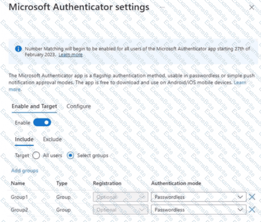 From Microsoft Authenticator settings for the subscription, the Enable and Target settings are configured as shown in the exhibit. (Click the Exhibit tab.)