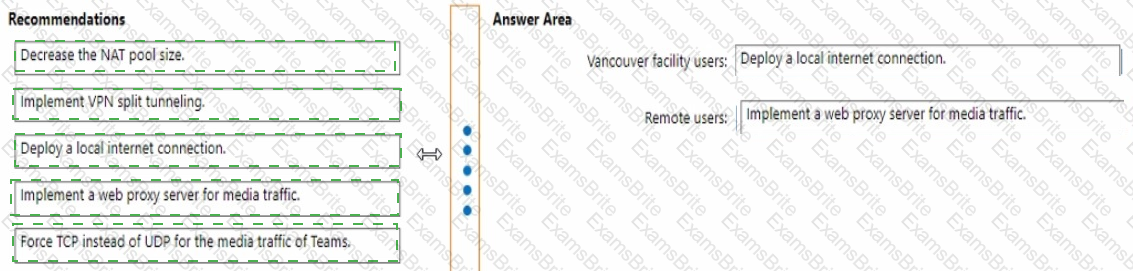 What should you recommend for the Vancouver facility users and the remote sale team users? To answer, drag the appropriate recommendation to the correct users. Each recommendation may be used once, more than once, or not at all. Vou may need to drag the split bar between panes or scroll to view content