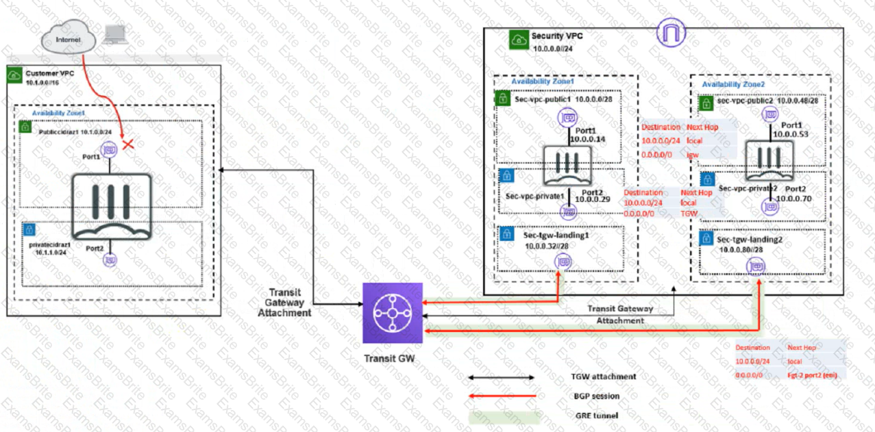 Also, you must ensure that the Customer VPC FortiGate VM sends all the outbound Internet traffic through the Security VPC How do you correct this Issue with minimal configuration changes?