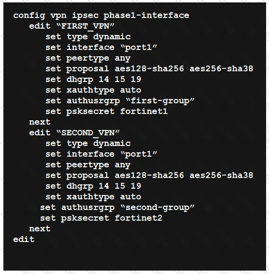 FortiGate has multiple dial-up VPN interfaces incoming on port1 that match only FIRST_VPN.