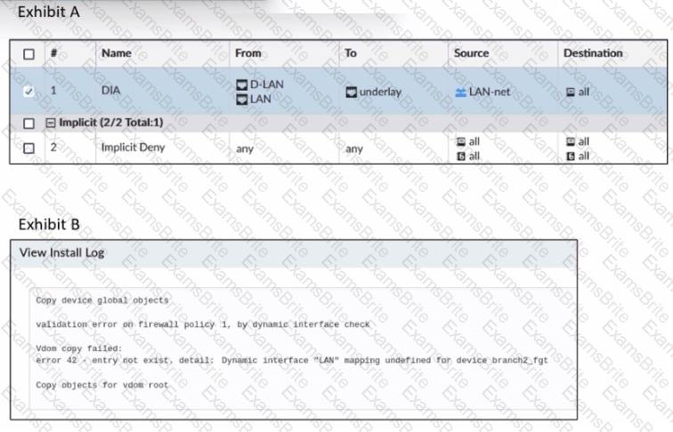 Exhibit A shows a policy package definition Exhibit B shows the install log that the administrator received when he tried to install the policy package on FortiGate devices.