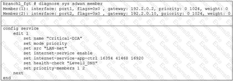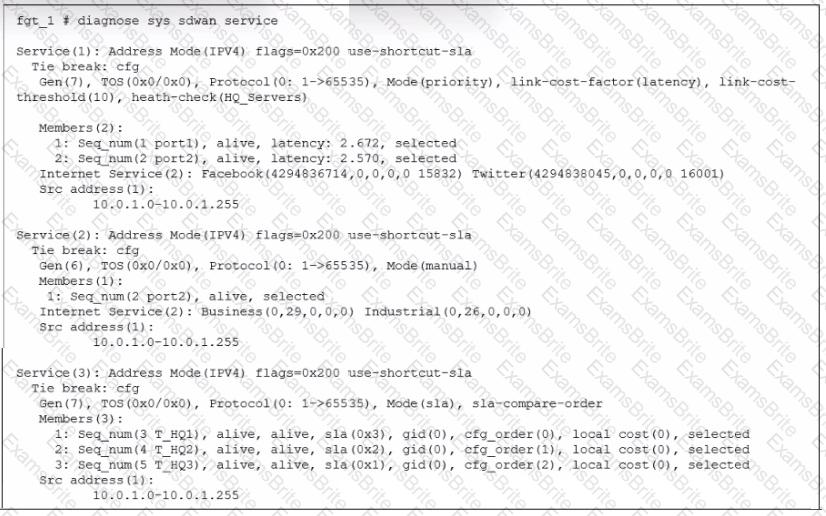 The exhibit shows output of the command diagnose 3vg sdwan service collected on a FortiGate device.