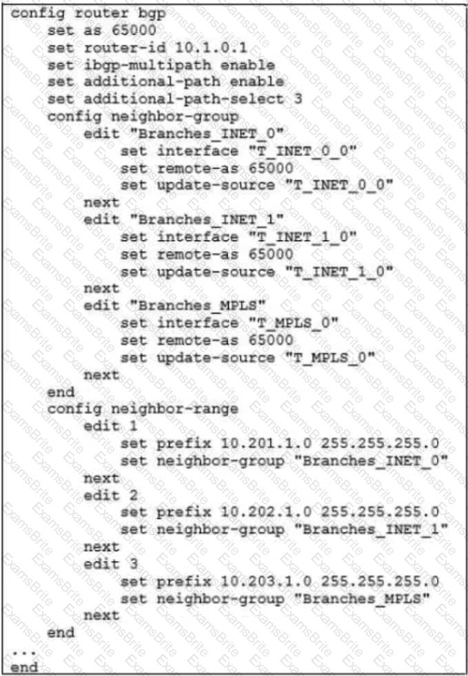 The exhibit shows the BGP configuration on the hub in a hub-and-spoke topology. The administrator wants BGP to advertise prefixes from spokes to other spokes over the IPsec overlays, including additional paths. However, when looking at the spoke routing table, the administrator does not see the prefixes from other spokes and the additional paths.