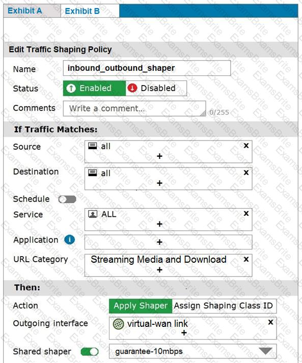 Exhibit A shows the firewall policy and exhibit B shows the traffic shaping policy.
