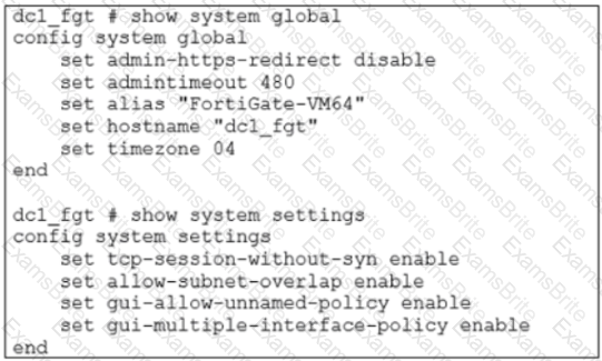 Exhibit A shows a site-to-site topology between two FortiGate devices: branch1_fgt and dc1_fgt. Exhibit B shows the system global and system settings configuration on dc1_fgt.