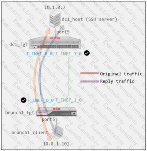 When branch1_client establishes a connection to dc1_host, the administrator observes that, on dc1_fgt, the reply traffic is routed over T_INET_0_0, even though T_INET_1_0 is the preferred member in the matching SD-WAN rule.