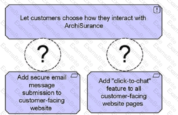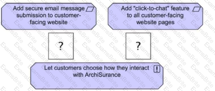 (A diagram showing"Add secure email message submission to customer-facing website"and"Add 'click-to-chat' feature to all customer-facing website pages"at the top, both connected to"Let customers choose how they interact with ArchiSurance"at the bottom with a missing relationship type.)