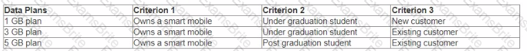 MyCo, a telecom company, developed a new data plan group to suit the needs of its customers. The following table lists the three data plan actions and the criteria that customers must satisfy to qualify for the offer: