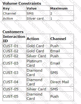 A volume constraint uses the Return any action that does not exceed constraint mode. The following tables show the configuration of the volume constraints and the list of customers in the outbound segment: