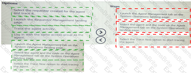 select and move the three option that are required for tracing an agent on one of the nodes in a cluster to the step column and place them in the correct order