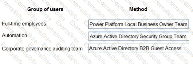 What should you recommend? To answer, drag the appropriate methods to the correct groups of users. Each method may be used once, more than once, or not at all. You may need to drag the split bar between panes or scroll to view content.