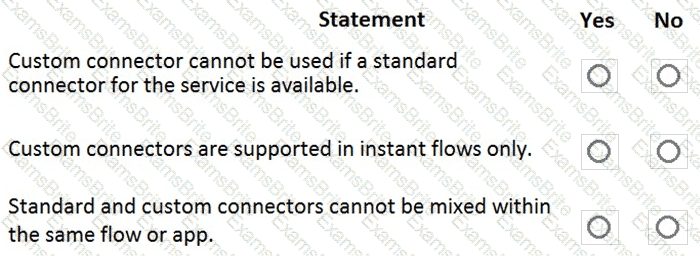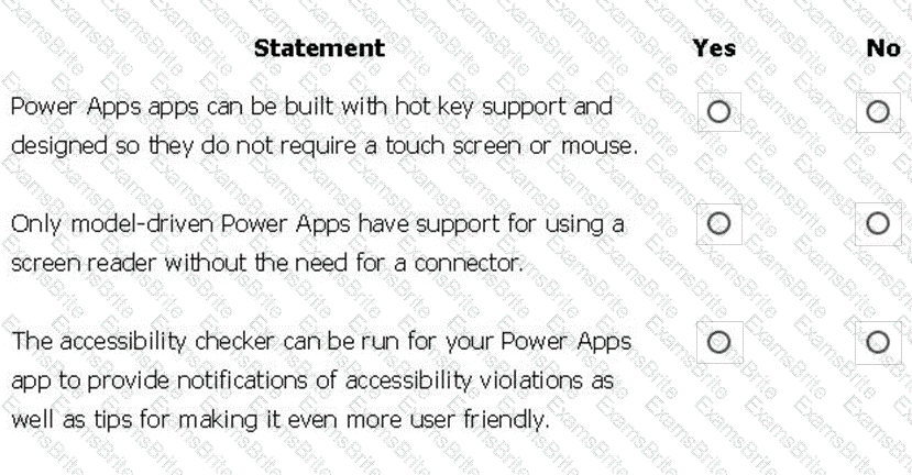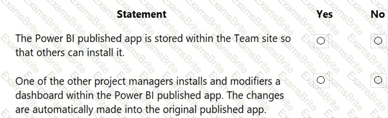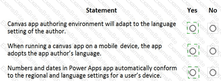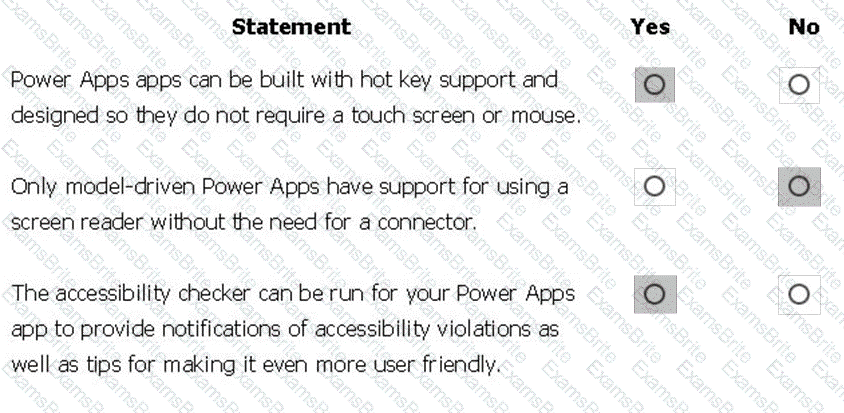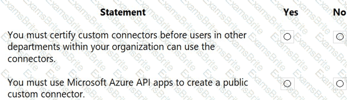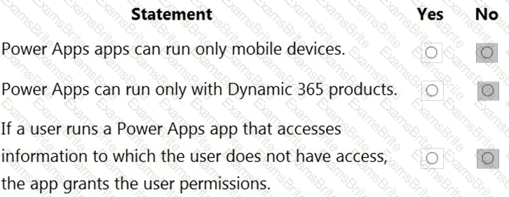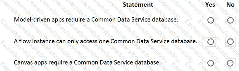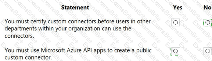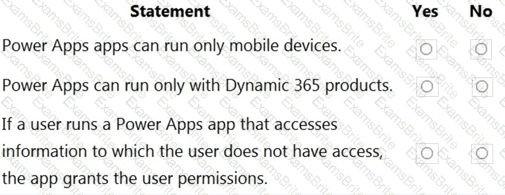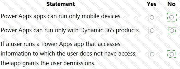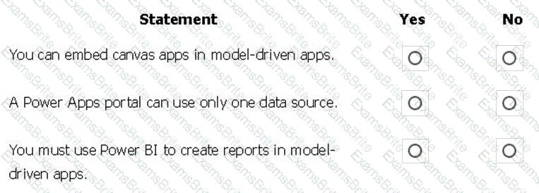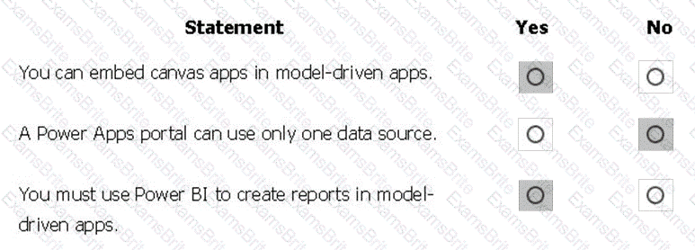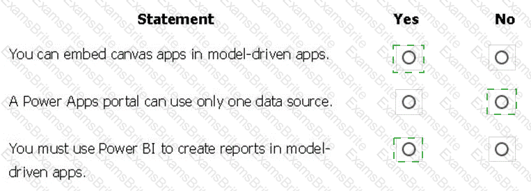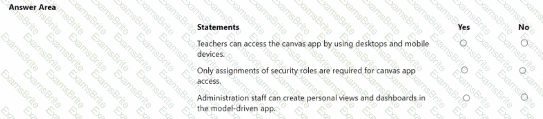 A tutoring company has developed and deployed a model-driven app for the administration staff and a canvas app for teachers. Instructions: For each of the following statements, select Yes if the statement is true. Otherwise, select No.