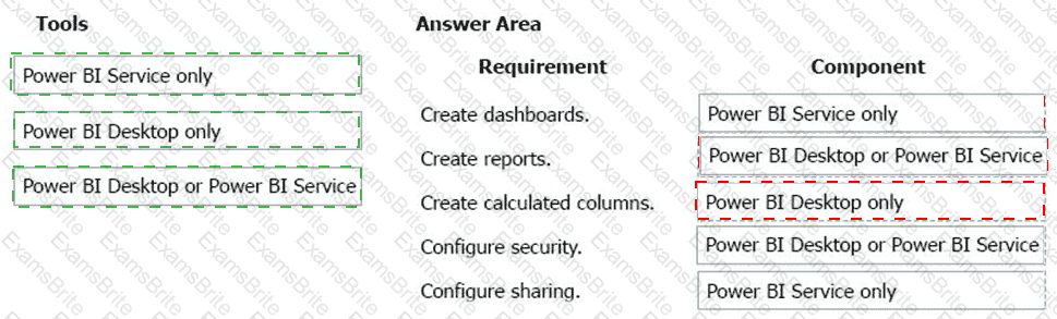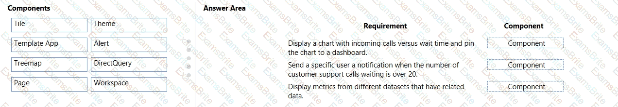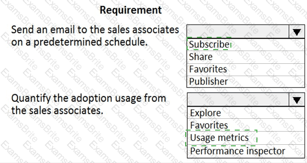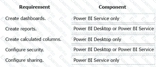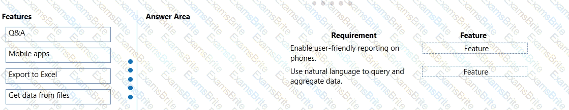 Match each Power Bl feature to its requirement. To answer, drag the appropriate features from the column on the left to its requirement on the right. Each option may be used once, more than once, or not at all.